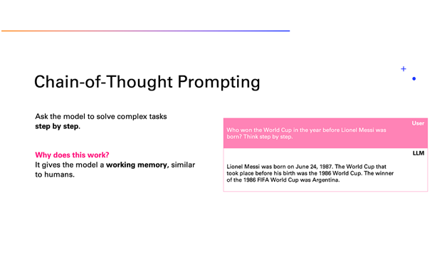 Another interesting ability of LLMs is also reminiscent of human intelligence. It is especially useful if the task is more complex and requires multiple steps of reasoning to solve.