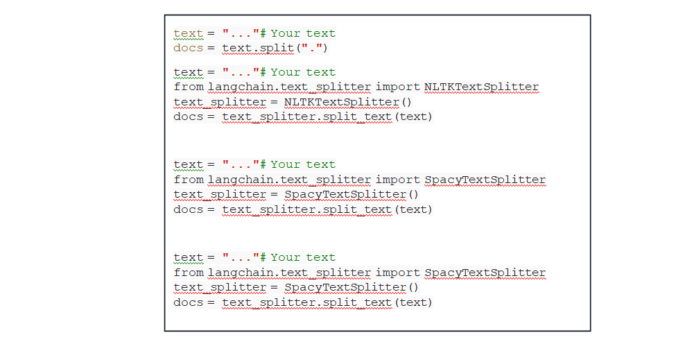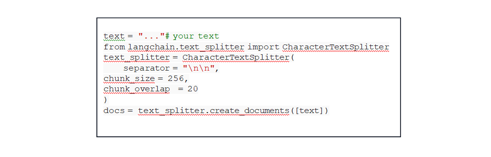 - Fixed-size chunking: Simply decide the number of tokens in our chunk along with whether there should be overlap between them or not. Overlap between chunks guarantees there to be minimal semantic context loss between