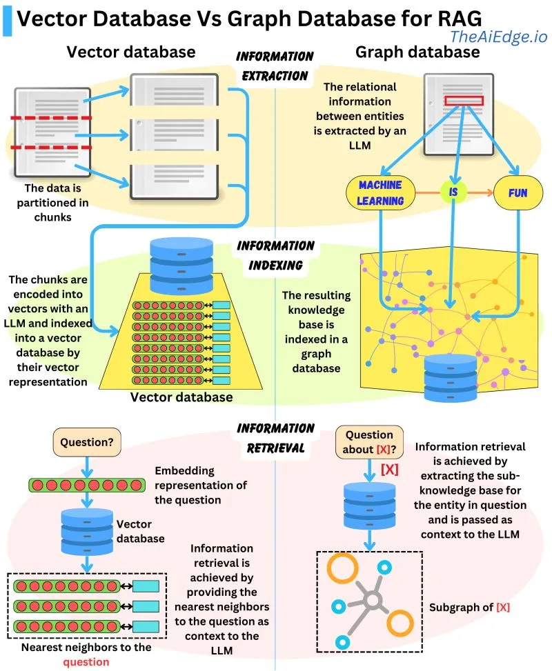 - Graph Databases, on the other hand, build a knowledge base from extracted entity relationships in the text, making retrievals concise. However, it requires exact query matching which can be limiting.