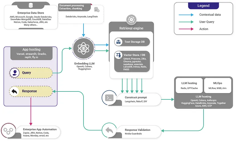 - Combining Data: The chosen data segments from the database are combined with the user’s initial query, creating an expanded prompt.